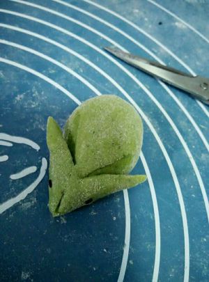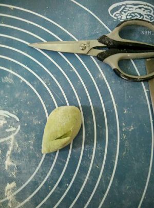 耳朵完成后,再用剪刀在面团尖位横着剪一刀,就变成上下唇,接着再上唇中间位置剪一刀就成兔唇啦