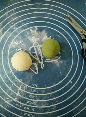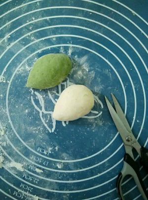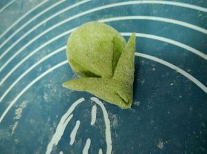 想要什么颜色的兔子,就准备什么颜色的面团,黄色兔子用南瓜面团,白兔用纯色面团,绿色用菠菜面团,发酵前步骤同普通馒头一样,故在此省略,二次排气后,取一小剂面团,