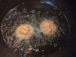 油锅热至180度,把做好的肉丸放入,定型后转中火炸至七成熟后捞出沥干油分备用。
