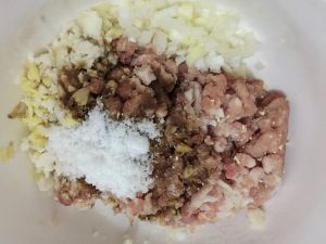 将瘦肉剁成泥,肥肉切成小丁,加入葱蒜末,盐,糖,生抽,料酒,白胡椒粉,三个鸡蛋(我做的肉多,所以加入三个鸡蛋,鸡蛋的数量,需要看实际情况)加入肉末中,一个方向搅拌上劲