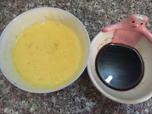 2个鸡蛋加入适量淀粉搅拌成糊状,容器中倒入3勺生抽,1勺盐,1匙糖调成汁。