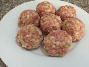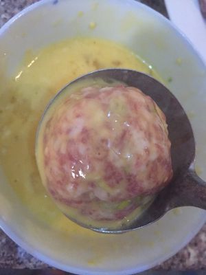 将去皮的熟鸡蛋分别包入肉馅中,做成大丸子(手上可先沾水再抓肉馅,防止粘手。)
