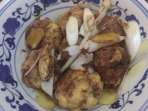洗净锅,放入炸好的丸子,加入水,葱段、姜片,煮开后改成中小火,一边煮一边用汤勺把汁舀起浇在丸子上。大约10分钟,加入冰糖至溶化,水淀粉勾芡收汁即可。