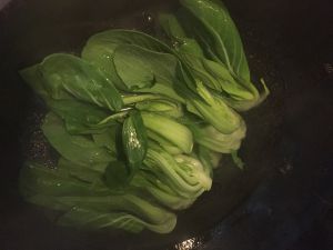 另起锅,将洗净对半切开的小油菜放入热水中加少许油和盐焯熟