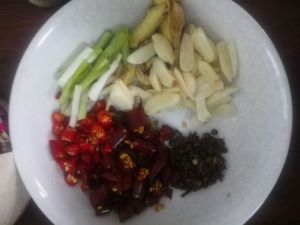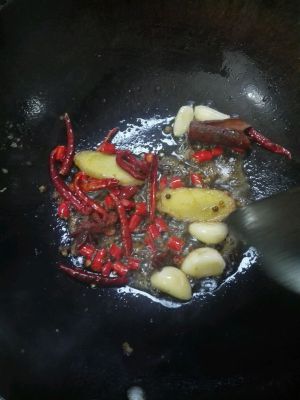 放入姜片,蒜,花椒,干辣椒,桂皮,八角。炒出香味(想辣一点就把干辣椒切碎)