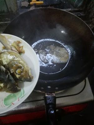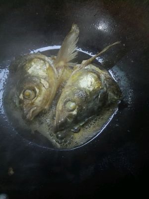 炒出香味之后,把煎好的鱼头放进去。加水,盖上盖子。
