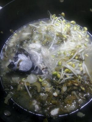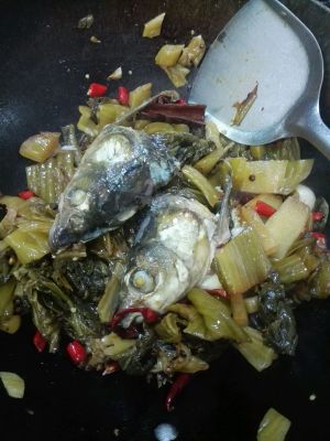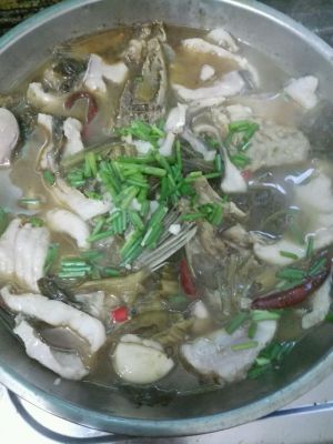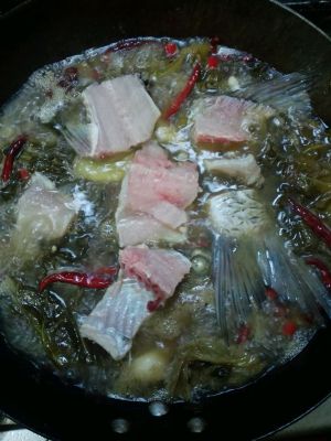 锅中加油放入姜蒜,放入酸菜炒一分钟,再放入鱼骨炒一分钟,加足量开水或高汤先烧开再改中火煮20分钟,捞出放入碗底