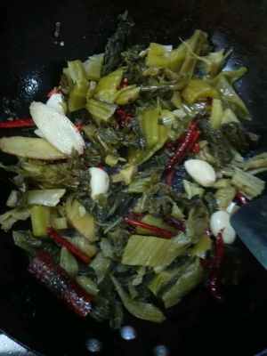 加入红辣椒和切好的酸菜翻炒出香味然后加入一勺豆瓣酱翻炒一下。