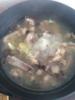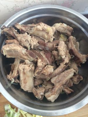 冷水锅放入排骨,加入葱姜蒜、花椒、八角和少许盐炖煮一个小时