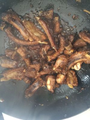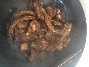 另一锅内放油,将煮后的排骨进行煸炒,至金黄色