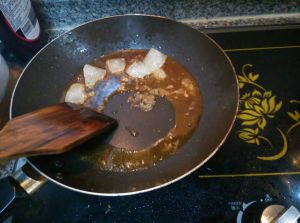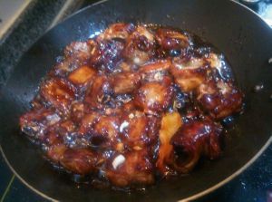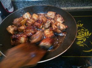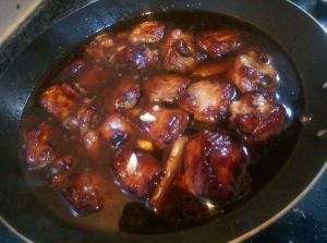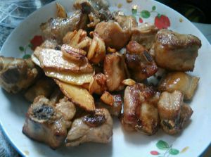 将煎好的排骨重新入锅,浇入拌好的调味汁,同时加入几瓣大蒜,去油腥味(也可不加)
