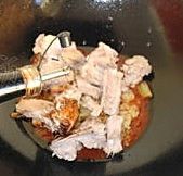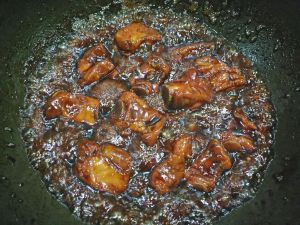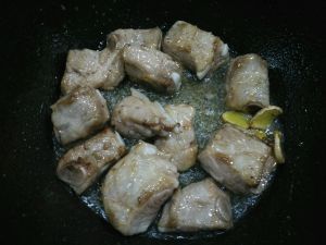 姜片下锅爆香,排骨炸至7-8分熟后加入冰糖(油温要高最好是180度要不排骨会吸收过多的油)。
