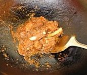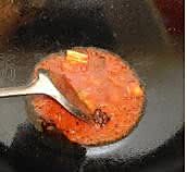 番茄酱加少许水,搅拌均匀,单纯的番茄酱太粘稠。锅中放少许油,比平时炒菜少一些,只要能把佐料炸出香味就可以。放入八角﹑桂皮和香叶,小火将其炒香。 炒出香味后,再放入姜片和葱段,炒香。姜片和葱段放的太早,容易炸糊,所以后放。 倒入番茄酱,翻炒均匀。