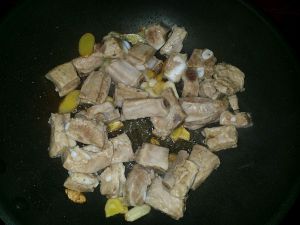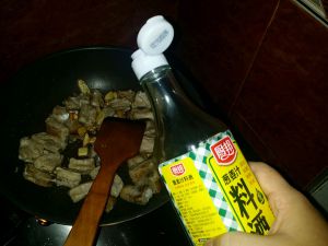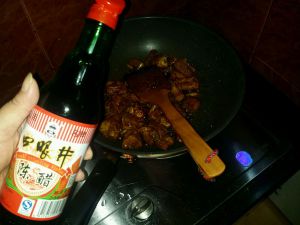加入生抽、糖、陈醋,炒干待排骨收汁