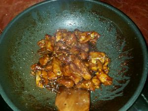 糖化开以后倒入排骨反复翻炒,使糖均匀的裹在排骨上。