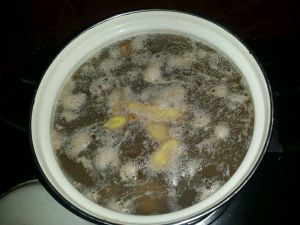排骨放入锅里,放5片姜,倒入米酒,开火煮10分钟,将血水煮出。