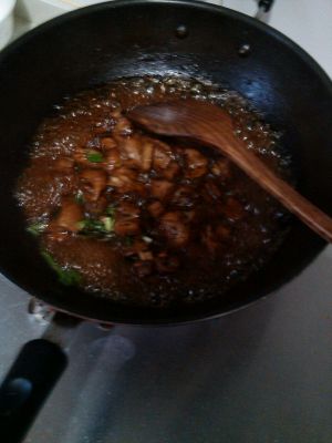 小火慢炖30分钟左右后,转大火收浓汤汁,加两勺砂糖,少许盐提鲜,待收汁差不多时,加入适量白醋,翻炒,起锅。