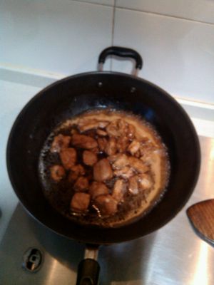 锅里放入30克花生油50克冰糖,烧至变成咖啡色,有一点冒烟。