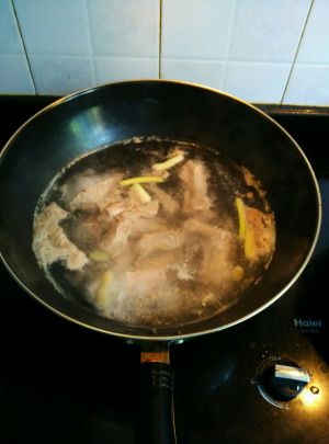 肋排洗干净,冷水下锅,锅内放入葱姜料酒去腥,煮开