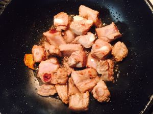 第四步:到入排骨迅速翻炒均匀 在到入适量料酒 在翻炒