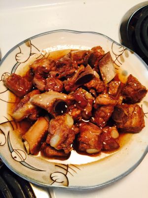 4.锅里加油加糖(冰糖最佳,砂糖就行)。 糖化开以后放入排骨上色,然后放姜蒜炒,放酱油、醋、料酒。