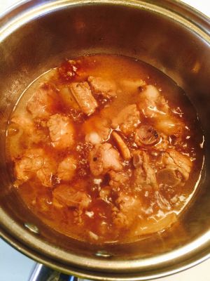 第五步:然后加水莫过排骨,加醋 生抽 老抽