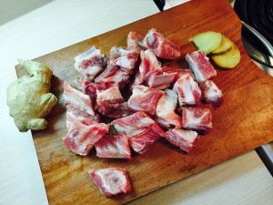 1.排骨洗净(什么类型的排骨都可以,左边一点点排骨就二十五元以上了,所以我又加了一点猪肉。) 2.姜切片,蒜拍裂,葱切粒。
