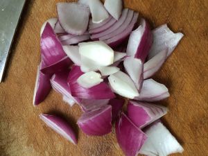 压牛肉的时间准备了土豆、洋葱,切块。我的土豆切的太大块了,可以切小块点。土豆切好泡水里,防止变色!