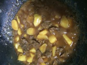 热锅先翻炒下土豆,加入牛肉,加调味料(盐、调和面、糖、少醋)翻炒几次,加水淹至离菜2厘米以上,盖上锅盖,小火慢煮至土豆、牛肉完全软(勤看着水,小心糊锅,适时加水),加入胡萝卜,加入适量咖喱块,翻两下,煮2分钟,可以密西西啦