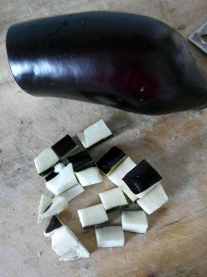 锅内放油 下蒜末葱花爆香 下青椒 下肉丁炒至水分蒸发 青椒表皮微焦 倒入茄子 倒入调料汁一碟 大火翻炒均匀 出锅前点半勺醋加香菜快速爆炒炒匀即可