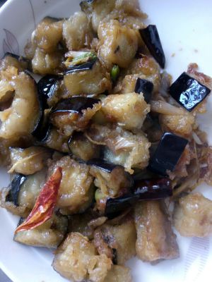 锅里放少许油,把葱,姜丝,辣椒,放入,再把炸好的茄子放入,放着酱油,加入少于的水,调料放入,反几下即可出锅。