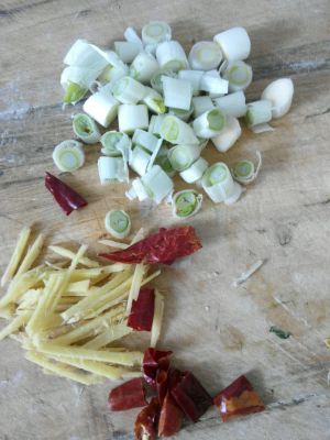 辣椒和蒜切碎。调一碗酱汁,放入淀粉、酱油、香醋、糖,倒入三分至二碗水备用。