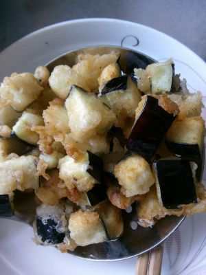 放入油,茄子放入开始炸,炸制成金黄色出锅。