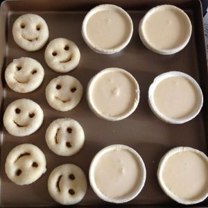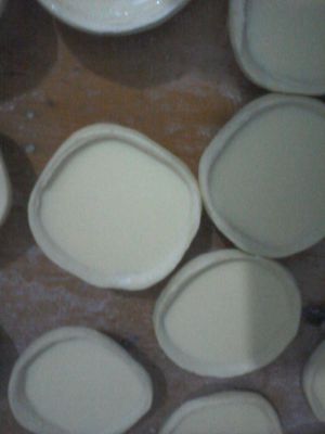 全部倒完,这个量刚刚好够六个;因为招待小朋友,我同时放了几个笑脸薯饼,和蛋挞皮一起买的;