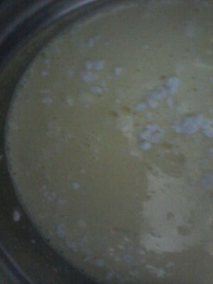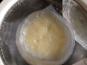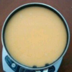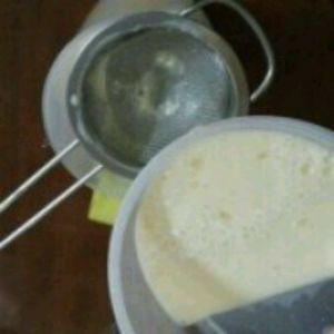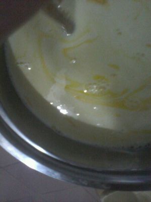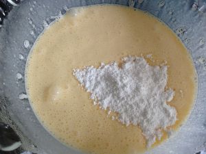 糖水降温至60度时冲入拌匀的蛋液里,再搅拌均匀。