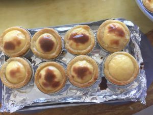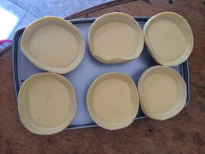 纯牛奶,炼乳,白砂糖,淡奶油隔水加热至融化,放凉之后加入三个蛋糕搅匀,在筛入低筋面粉,倒入七分满的挞水
