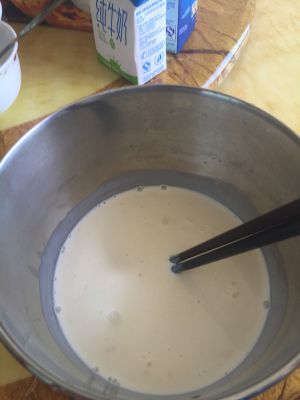 分别放入淡奶油,牛奶,蛋黄(搅拌过筛)、炼乳