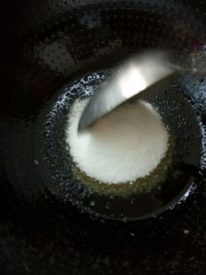 锅里不放油,把白糖跟水加进去小火慢熬,成焦糖色即可