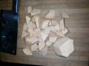 1.把地瓜洗干净,滚刀切大块的丁。备用
