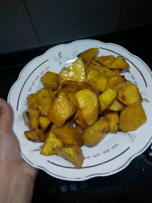 4.把油倒出,利用锅底的剩5油,小火将糖溶化并熬至消泡浓稠。 倒入炸好的地瓜快速翻勺,糖汁裹匀后移入抹了油的盘子里。