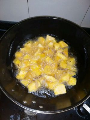 2.锅里加入,花生油锅中烧热,放入地瓜炸透至外皮微脆捞出。