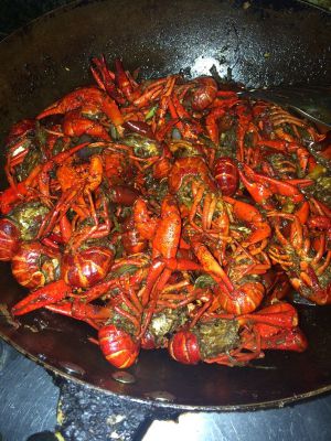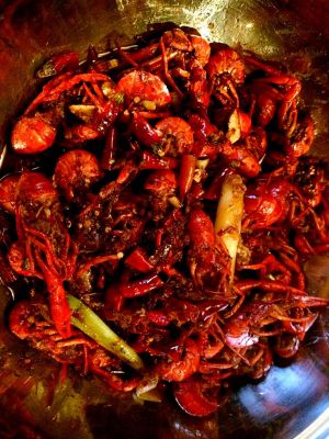 倒入小龙虾翻炒,大概10分钟,最后把葱放入锅内,翻炒1-2分钟出锅