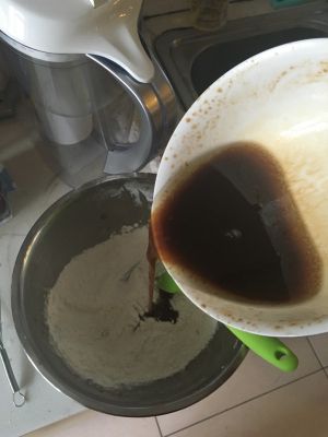 把油水混合物倒入面粉混合物里,搅拌均匀!