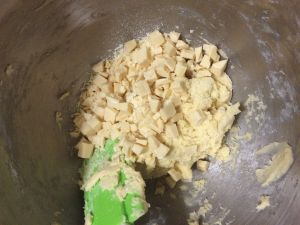 黄油切丁与糖粉切匀