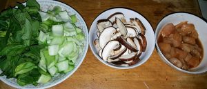 备菜:油菜分茎叶切碎,香菇切片,鸡肉切丁加盐、料酒、生抽腌制