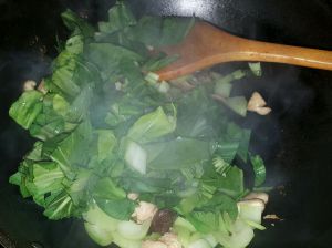 锅底放油,待油热,依次放油菜茎、香菇、鸡肉,盐,鸡肉下锅会粘不用怕,多翻炒,菜茎会出汤,就不粘了。最后放菜叶,一起翻炒。大概1分钟左右,待没什么菜汤了,可以盛出。