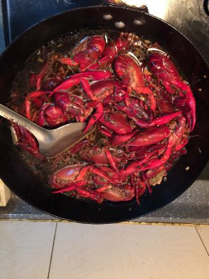 倒入龙虾翻炒,加入白酒50ml,老抽、生抽、盐、冰糖、适量。