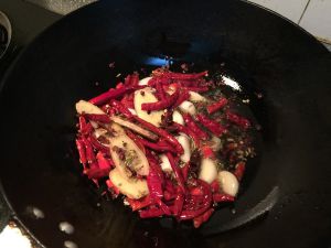锅内倒入油,冷油时倒入蒜、辣椒、姜片、花椒、辣椒翻炒。