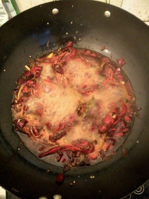 锅内倒入多多的菜籽油,下姜,蒜,花椒,八角进去炸出香味,油要比平时炒一盘菜的量多出3倍左右,这样炒出来的小龙虾特别香。