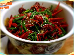 汤汁基本收干后,撒上小葱、芝麻,怪味小龙虾出炉啦!
